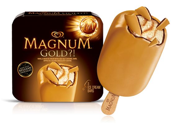 Magnum staat bekend om de dikke laag chocolade rondom een blok roomijs. Nu is er een nieuwe smaak geïntroduceerd, namelijk de Magnum Gold: het eerste gouden ijsje ooit! Onder de goudkleurige melkchocoladelaag zit ijs met verschillende smaken: vanille, karamel en een vleugje zeezout maken het ijsje helemaal compleet!