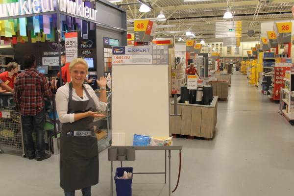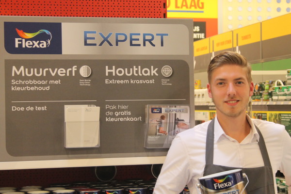 De demonstrateurs met Flexa schort en zogenaamde schrobkaarten om te testen en (highlight) stiften droegen zorg voor een opvallende en sympathieke demo op het verf mengplein. Hier wachten consumenten vaak nog om verfadvies te krijgen of kleuren uit te zoeken. De toegevoegde waarde Flexa Expert Muurverf voor binnen: schrobbaar met kleurbehoud, anti spat en in 1 x dekkend voor egaal resultaat. Flexa Expert muurverf garandeert bovendien dat je langdurig je muren mooi kunt houden. Het beschermt in alledaagse omstandigheden, bijvoorbeeld bij kleine ongelukjes met vuil of etensresten. Ideaal voor drukke huishoudens met huisdieren en kinderen, maar ook voor nét die ene muur die meer bescherming nodig heeft.