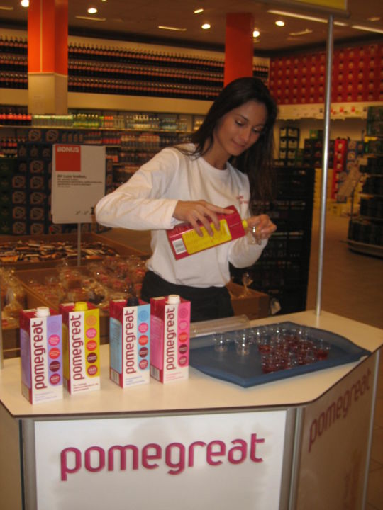 Men werd aangesproken en er werd een sample aangeboden, bij een positieve tasting werd men gewezen op de aanbieding die geldig was tijdens de tasting. Zodoende maken veel prospects kennis met Pomegreat en wordt de verkoop actief bevorderd. Granaatappelsap is verkrijgbaar in 1 liter verpakkingen bij diverse supermarkten, maar ook bij gezondheidswinkel de Tuinen.