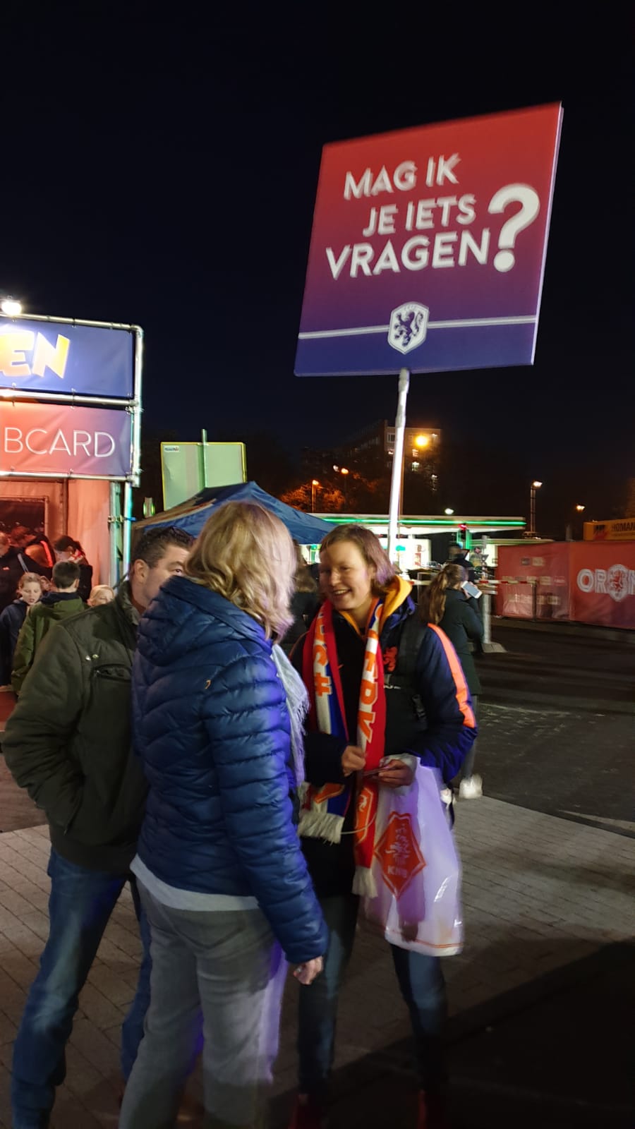 Op grote evenementen is het natuurlijk erg van belang dat iedereen gemakkelijk en snel de weg kan vinden. Voor de KNVB maken wij enquêteteams en hostessen mogelijk. Het doel is om alle mensen met vragen te helpen. Door middel van een enorm billboard en mega ballon zijn de enquêteteams en hostessen voor iedereen goed zichtbaar. In elke zone van het stadion is een in NIKE gekleed enquêteteam en hostess van J.u.i.c.e. te vinden, duidelijker kan niet! NIKE is namelijk sinds 1996 kledingsponsor van de KNVB. Ook daar hebben we natuurlijk rekening mee gehouden. Op locatie ontvingen zij een vest/jas met het NIKE logo, zodat zij, als zij zelf geen NIKE kleding bezitten, toch NIKE kunnen dragen.