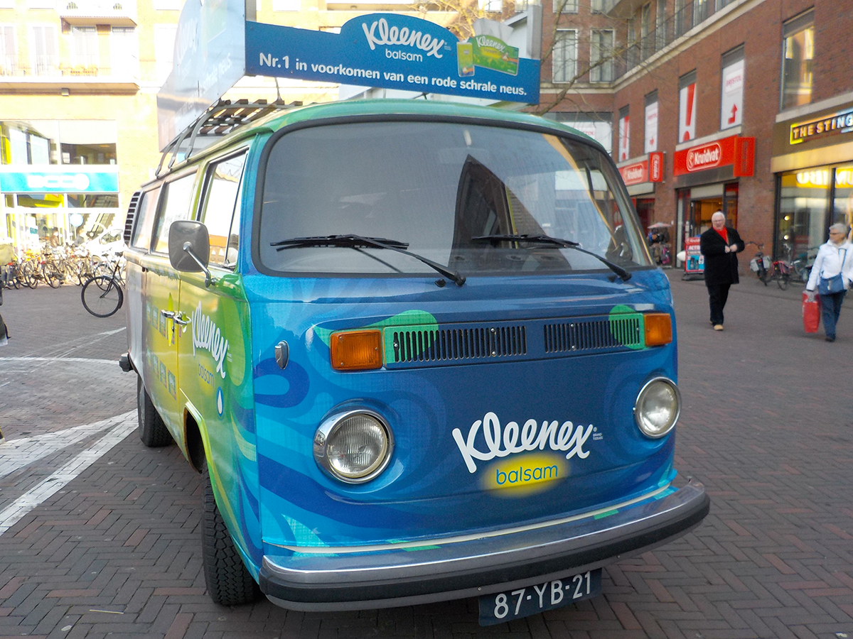 We toverden een Volkswagen busje om tot een heuse Kleenexbus en bezochten er diverse steden in Nederland mee. De bus was niet te missen door zijn kleurtjes, maar er waren ook meerdere tissueboxen aan bevestigd. Aan de buitenkant!