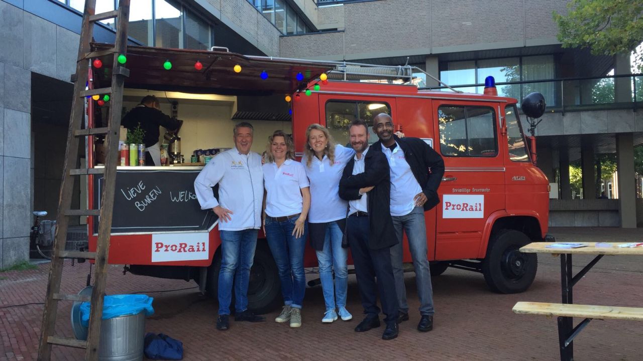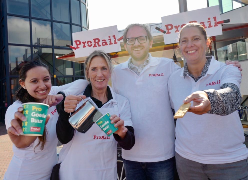 Wie kent Prorail nou niet? Het is de grootste buur van ons land, want 2 miljoen mensen wonen in Nederland tot 300 meter van het spoor. Prorail is erg betrokken in de maatschappij, luistert graag naar hun buren en gaan graag met elkaar in gesprek. Op 25 plekken in Nederland kon je ons vinden! Buren konden bij een van onze 23 koffiekarren met eigen barista terecht voor een heerlijk kopje koffie van Douwe Egberts. Om het extra feestelijk te maken kreeg iedereen een uniek koekje, namelijk een Spoorkoek van meesterbakker Robert van Beckhoven, patissier en presentator van Heel Holland Bakt.