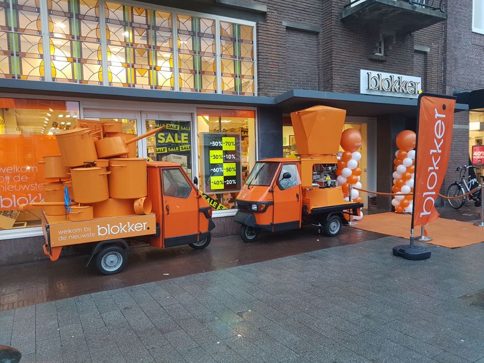 We plaatsen 2 Piaggio’s voor de deur bij het filiaal. Eén ervan heeft een percolator (koffiemachine) en de andere een kunstwerk van pannen. Geheel in oranje gespoten als een nog duidelijkere aanduiding op de nieuwe huisstijl van de Blokker. De koffie zorgt voor veel traffic en dat het publiek zich lang bij de winkel ophoudt. Het nieuwe assortiment en de nieuwe uitstraling van Blokker doen de rest, zoals het hoort bij Shoppermarketing.