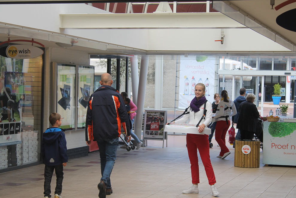 Omdat Spa Bruisend in een nieuwe slanke fles zit, staat deze centraal in de sampling actie. Het flitsende decor bestaat uit twee grote flessen welke de omgeving vullen met bubbels. De setting wordt compleet gemaakt met Bubbels met daarin kleinere flessen en het team deelt de goed gekoelde flesjes uit vanuit sample trolleys met nog meer bubbels.