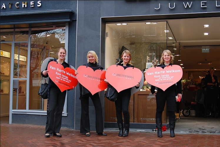 Het openingsconcept was: “Van harte welkom bij Juwelier Remark”. Hoe kan dit duidelijker worden gecommuniceerd dan vier leuke dames met een groot sandwichbord te laten rondlopen in de vorm van een hart! De dames spraken het winkelend publiek enthousiast aan en deelde hartensnoepjes uit. Iedere consument die op elke heel uur in de winkel aanwezig was maakte kans op een waardecheque van € 100,-.