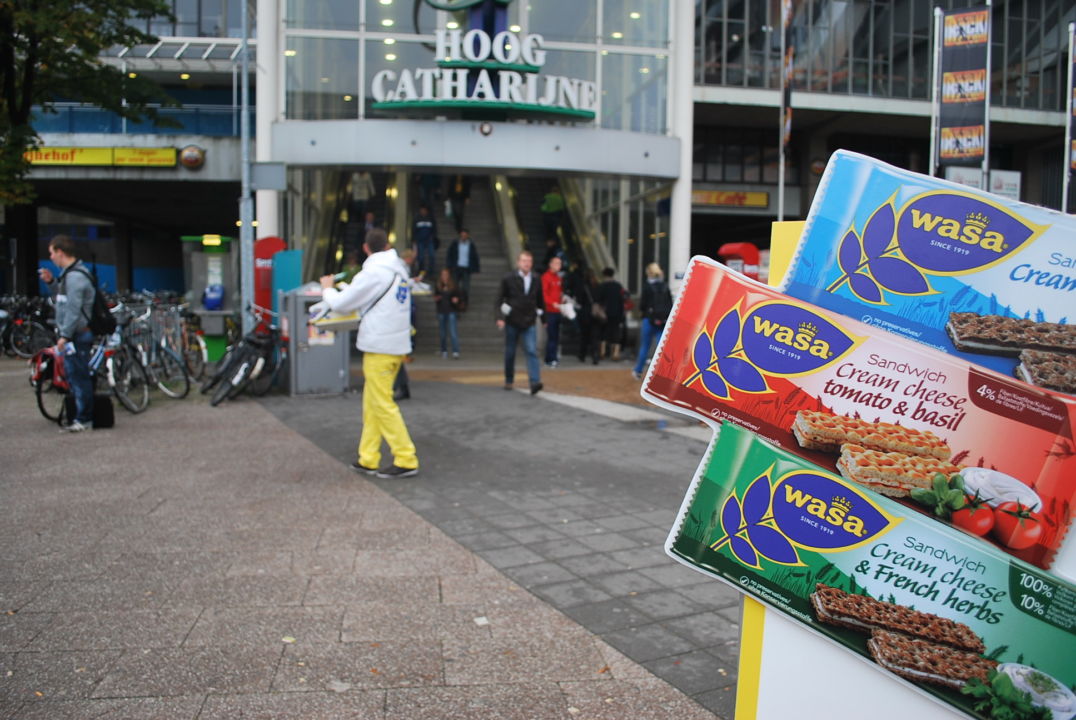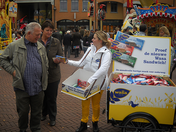 In opdracht van Backbone Marketing verzorgt J.u.i.c.e Promotions een sampling campagne voor de 3 nieuwe smaken Wasa Sandwich. De promotieteams zoeken de doelgroep actief op door zich in een flexibele setting met een grote, opvallende Wasa-bus regelmatig te verplaatsen naar drukke en relevante locaties (SWAP Sampling). Zo staat het team ’s morgens op een druk treinstation om zich vervolgens te verplaatsen naar kantoorgebouwen, universiteiten en winkelcentra.