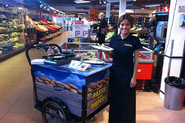 J.u.i.c.e. voert deze kookdemonstraties uit op een omgebouwde bakfiets. Dat is weer eens wat anders dan met een promo-unit werken op de winkelvloer! We gebruiken de bakfiets demo-unit om ’s werelds eerste Twitter bakfietsrace te promoten welke door ChannelUp is ontwikkeld. En ondertussen kookt de demonstratrice de meest heerlijke grechten natuurlijk.